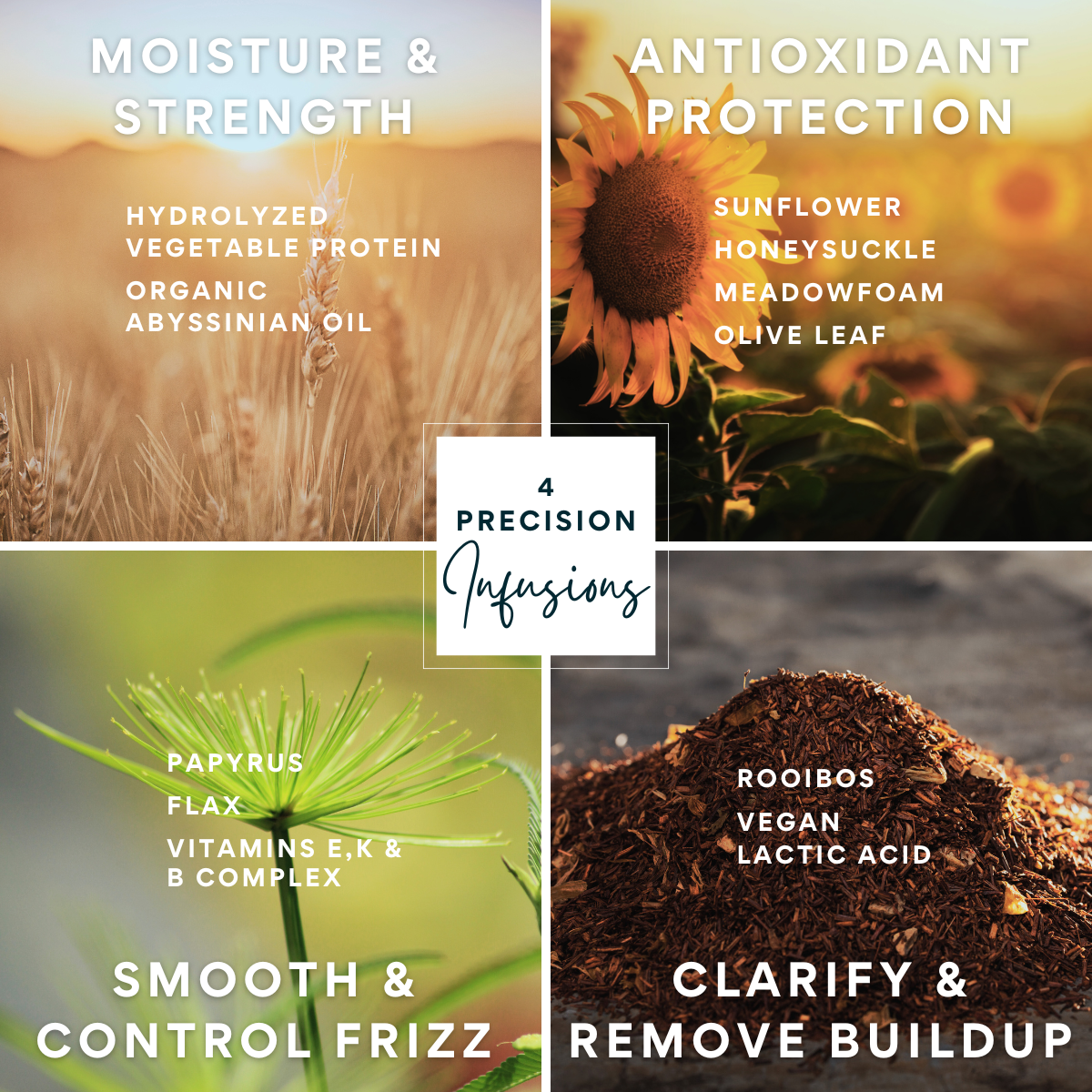 We then incorporate four separate infusions (blends) of natural plant extracts and vitamins. Together, a whopping total of 11 key ingredients deliver lasting hydration, concentrated nourishment and fortified protection against frizz, damage, color fade, and environmental stressors.